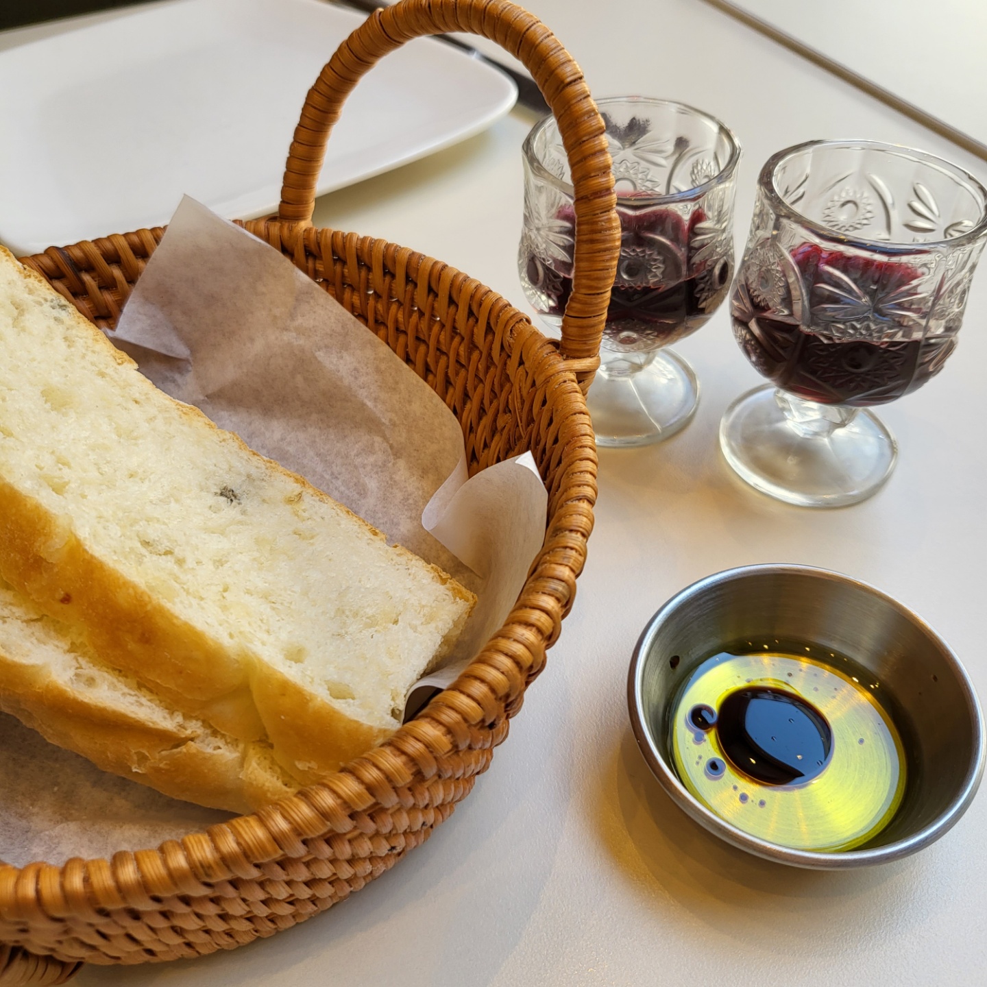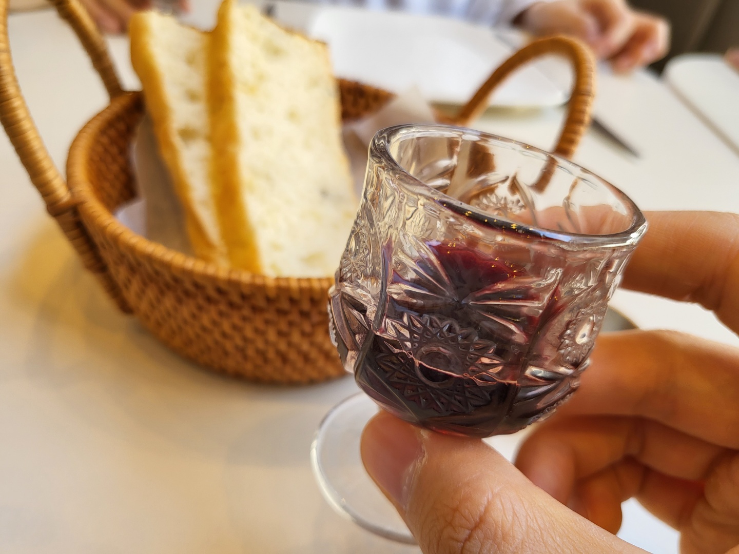 주문을 하고 나면 식전 빵과 미니와인이 나온다