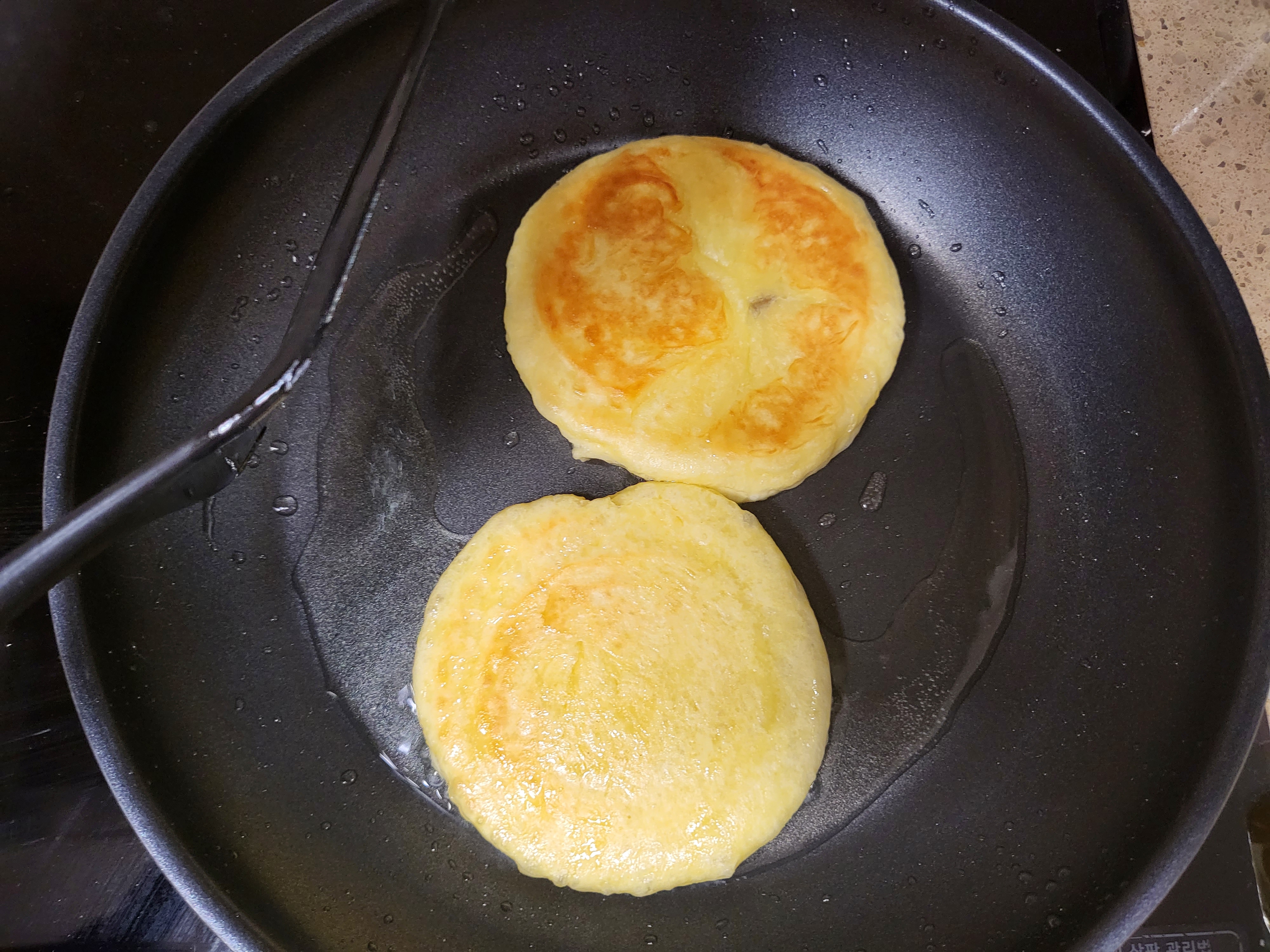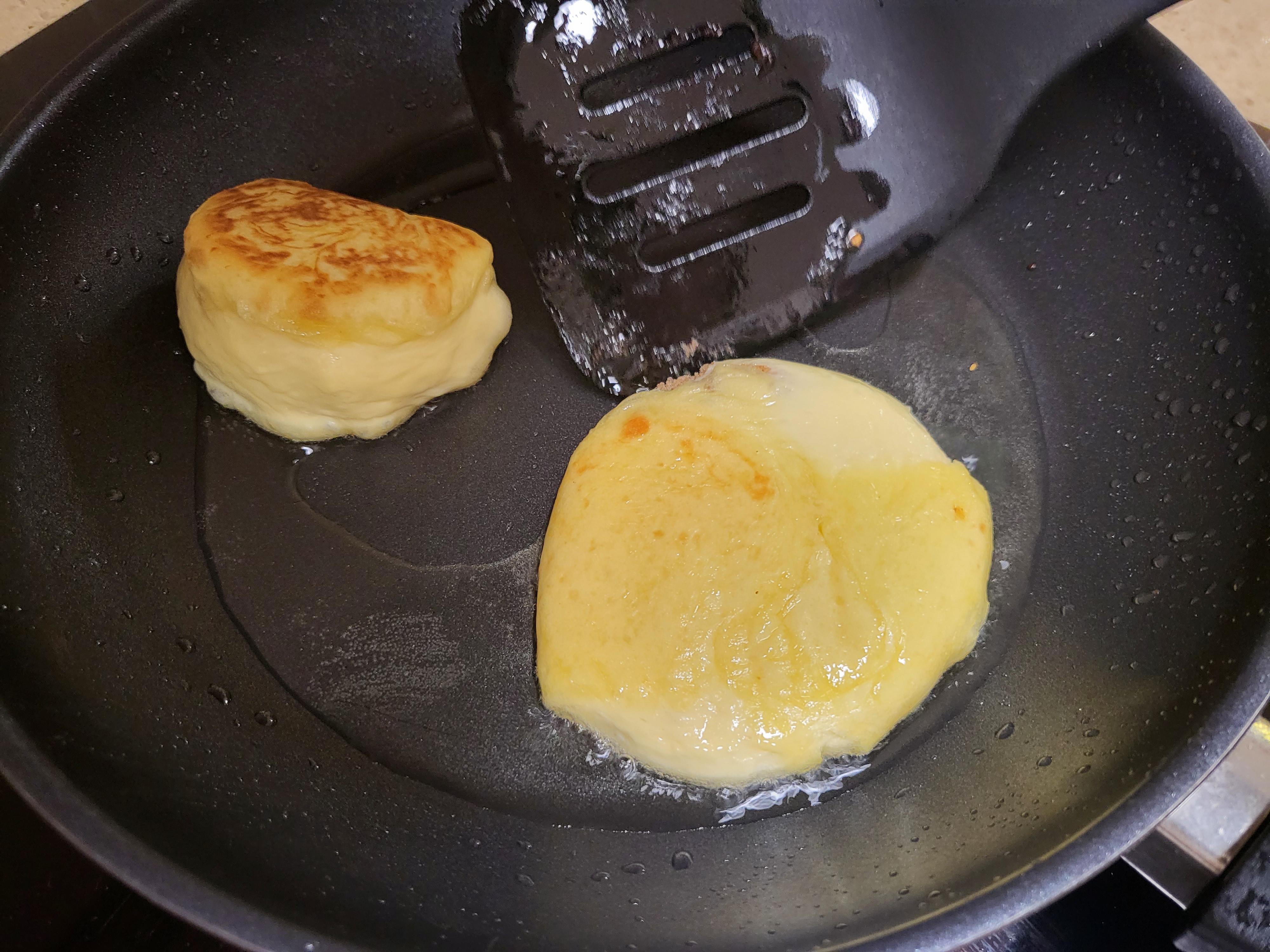 동그란 반죽을 뒤집개로 눌러준다