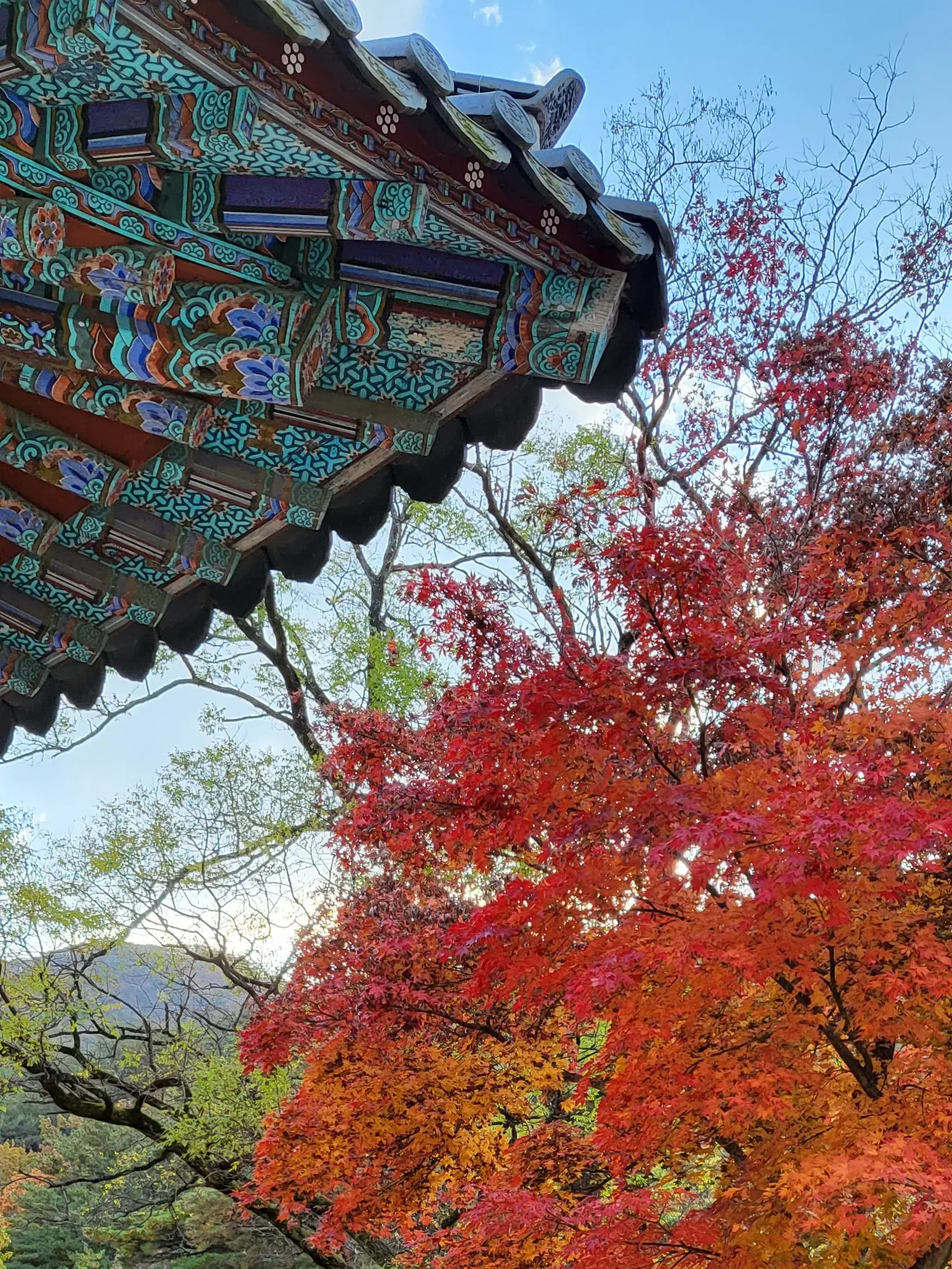 하늘을 배경으로 기와지붕과 단풍의 조화