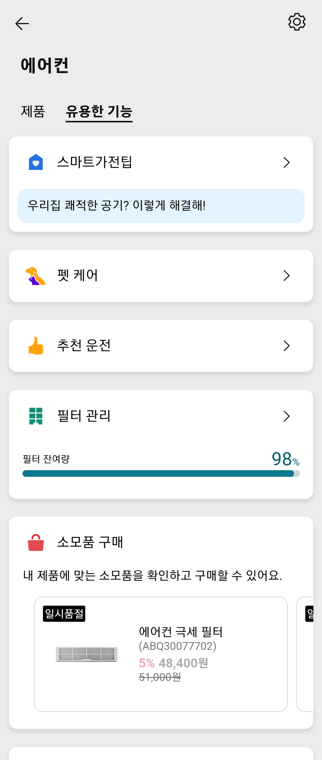 앱에서도 필터 잔여량이 다시 99%